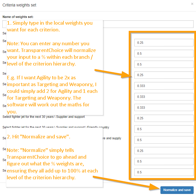 When you first open up criteria weights, you'll see the "Default" weighting scenario. TransparentChoice lets you have multiple scenarios so that you can do "what if" analysis or see how the results would look if different groups of stakeholders were making the decision.