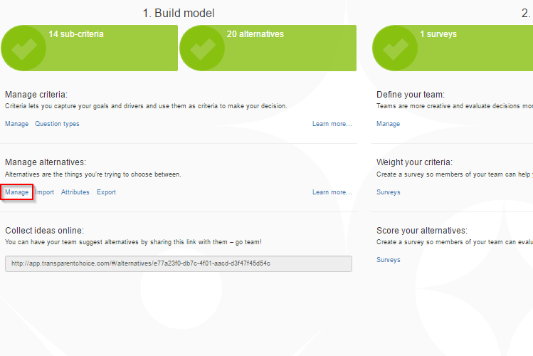 To access the Kanban, click on "Manage" under "Manage alternatives" on the dashboard.