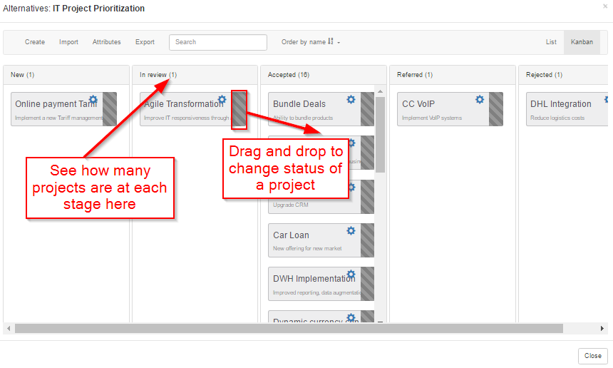 You can quickly see how many projects you have at each stage of the evaluation and approval process. There are currently 5 stages available and you can simply drag a project from one stage to the next. The 5 stages are;