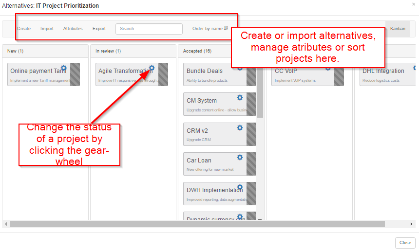 You can also change the status of a project by clicking on the gear-wheel and then selecting the stage you want the project to be at.